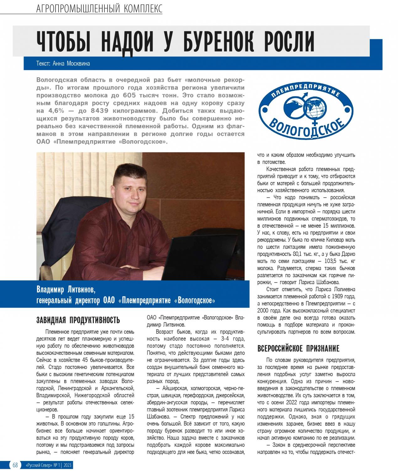 Вологодская область в очередной раз бьет «молочные рекорды». По итогам прошлого года хозяйства региона увеличили производство молока до 605 тысяч тонн. Это стало возможным благодаря росту средних надоев на одну корову сразу на 4,6% — до 8439 килограммов. Добиться таких выдающихся результатов животноводству было бы совершенно нереально без качественной племенной работы. Одним из флагманов в этом направлении в регионе долгие годы остается ОАО «Племпредприятие «Вологодское».