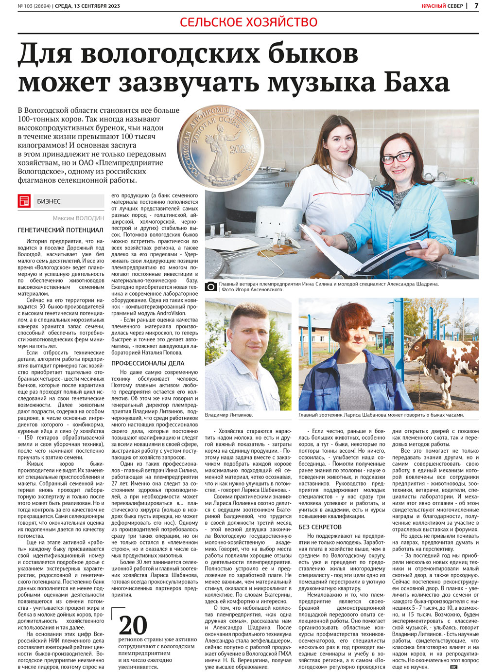 На основании этих цифр Всероссийский НИИ племенного дела составляет ежегодный рейтинг ценности быков-производителей. Вологодское предприятие неизменно в числе лидеров, поэтому спрос на его продукцию (а банк семенного материала постоянно пополняется от лучших представителей самых разных пород - голштинской, айширской, холмогорской, чернопестрой и других) стабильно высок. Потомков вологодских быков можно встретить практически во всех хозяйствах региона, а также далеко за его пределами - Удерживать свои лидирующие позиции племпредприятию во многом помогают постоянные инвестиции в материально-техническую базу. Ежегодно приобретается новая техника и современное лабораторное оборудование. Одна из таких новинок - компьютеризированный программный модуль AndroVision.