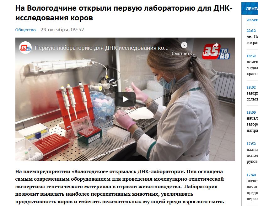 На племпредприятии «Вологодское» открылась ДНК-лаборатории. Она оснащена самым современным оборудованием для проведения молекулярно-генетической экспертизы генетического материала в отрасли животноводства. Лаборатория позволит выявлять наиболее перспективных животных, увеличивать продуктивность коров и избегать нежелательных мутаций среди взрослого скота.