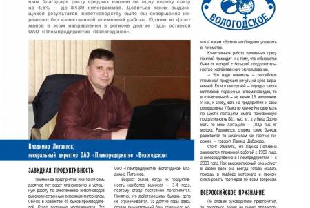 Вологодская область в очередной раз бьет «молочные рекорды». По итогам прошлого года хозяйства региона увеличили производство молока до 605 тысяч тонн. Это стало возможным благодаря росту средних надоев на одну корову сразу на 4,6% — до 8439 килограммов. Добиться таких выдающихся результатов животноводству было бы совершенно нереально без качественной племенной работы. Одним из флагманов в этом направлении в регионе долгие годы остается ОАО «Племпредприятие «Вологодское».